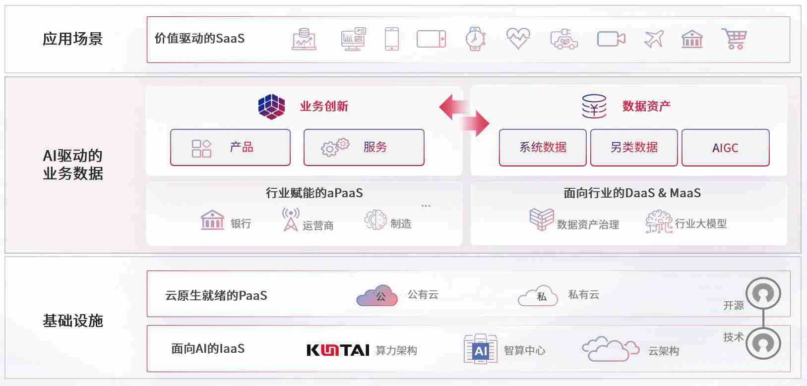 数字时代,,,围绕企业数字化转型的关键要素,,尊龙旗舰厅数码开创性的提出数云融合战略和技术体系框架,,,,着力在云原生、、、数字原生、、、、AI原生和信创产业上架构产品和服务能力,,为处在不同数字化转型阶段的快消零售、、、、汽车、、金融、、医疗、、政企、、、、教育、、、、运营商等行业客户提供泛在的敏捷IT能力和融合的数据驱动能力,,,构建跨界融合创新的数字业务场景和新业务模式,,助力企业级客户建立面向未来的核心能力和竞争优势,,全面推动社会的数字化、、智能化转型升级。。。。