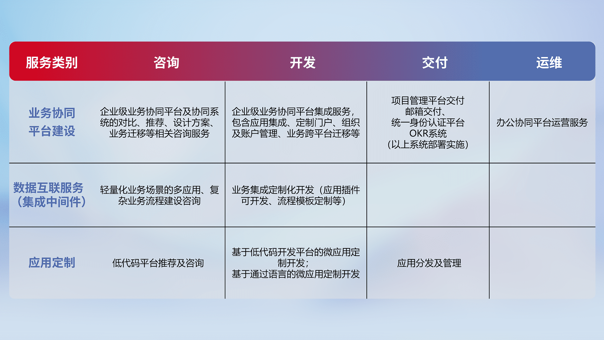 针对钉钉、、企微、、、IDaas等平台级产品提供产品的规划、、、方案、、交付、、、定制化开发等服务,,,实现如统一协同办公、、、、智能客户服务、、、、混合会议管理、、、、智能数据查询、、、等业务场景,,实现数字化转型。。。